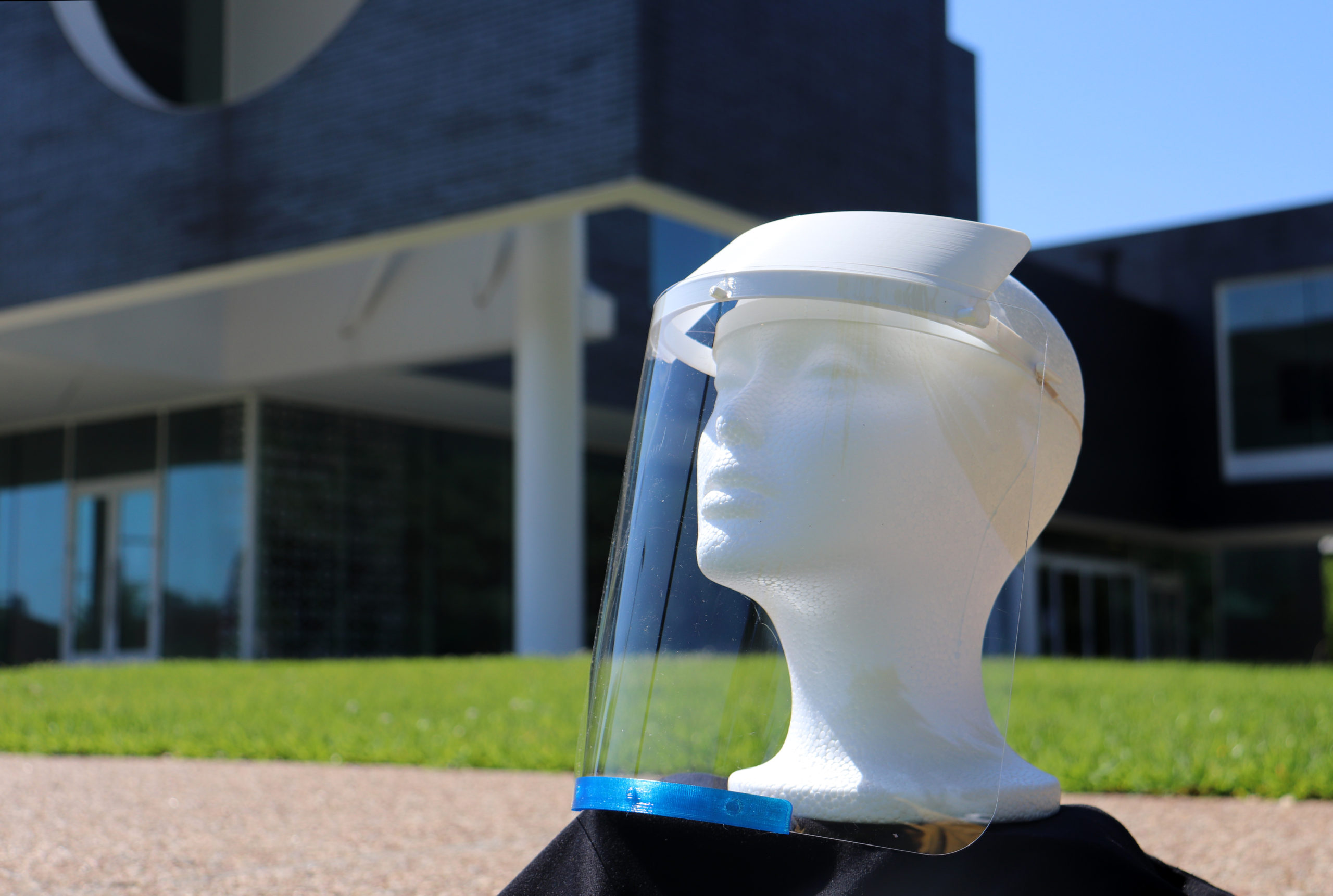 IMG_0822(2) ← Previous Next → A prototype face shield produced as part of a joint effort by the Rice Center for Engineering Leadership and Rice’s Moody Center for the Arts. (Photo by Jeff Fitlow/Rice University)