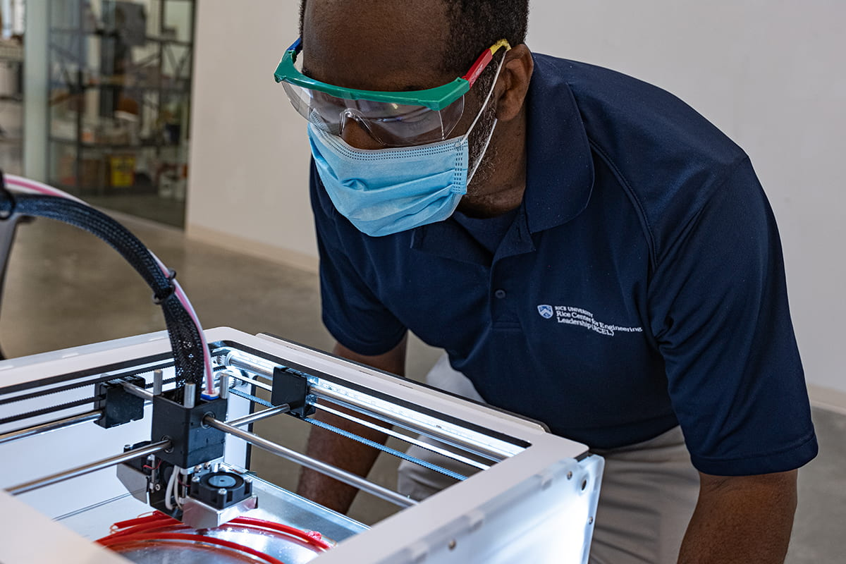 image ← Previous Next → A project begun by Fred Higgs, faculty director of the Rice Center for Engineering Leadership, could wind up producing hundreds of thousands of face shields. (Photo by Jeff Fitlow/Rice University)